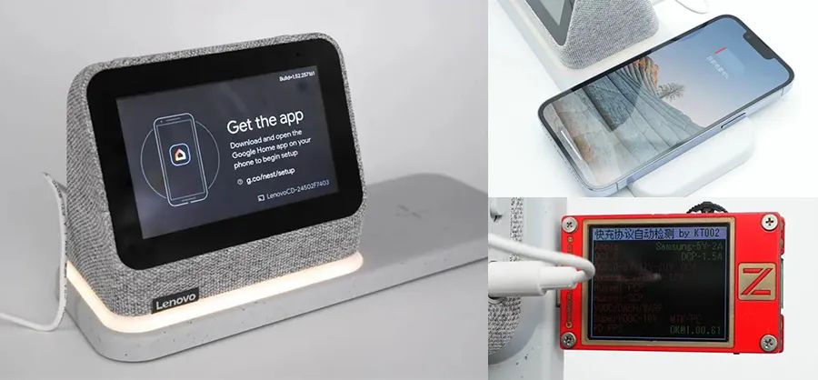 連接適配器并打開開關(guān),首先會(huì)出現(xiàn)一個(gè)讓用戶手機(jī)下載Google Home app的提示界面,即產(chǎn)品支持手機(jī)app智能控制,設(shè)置簡單方便。底座上的氛圍燈亮白光。同時(shí)可以將手機(jī)放在底座右側(cè)進(jìn)行無線充電,晚上入睡前為手機(jī)充電變得更加方便。使用ChargerLAB POWER-Z KT002測(cè)得USB-A口只支持Samsung 5V2A、DCP協(xié)議。