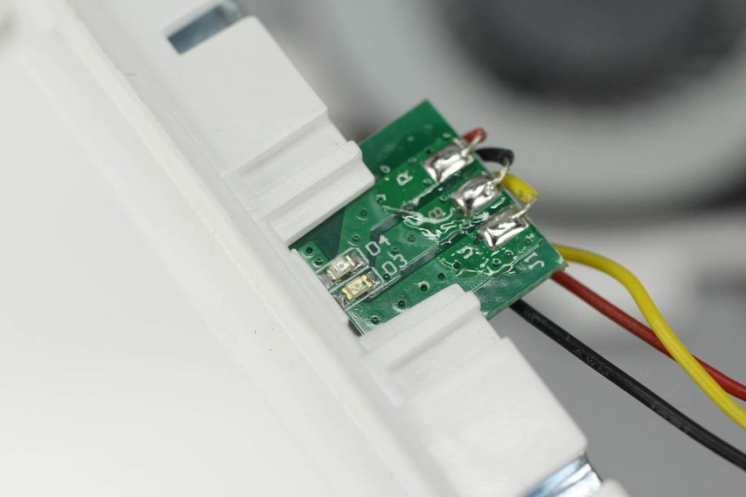 拆掉兩顆螺絲即可將底部外殼打開,風扇使用卡扣進行固定,并且風扇和PCB板間有一塊白色塑料板進行隔離。