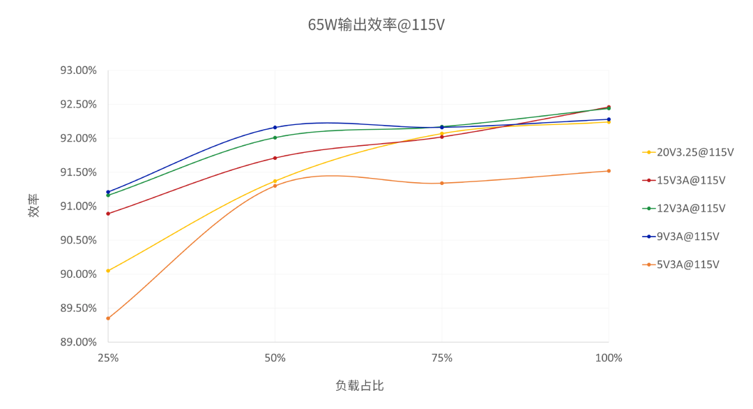 為保證產品的安全可靠性,設備長時間工作導致的發(fā)熱情況也是用戶的關注點。將方案在開放環(huán)境中,以20V/3.25A 65W的功率持續(xù)輸出1小時,各關鍵器件的溫度均保持在較好的溫度范圍內,符合安規(guī)要求,可靠性高。