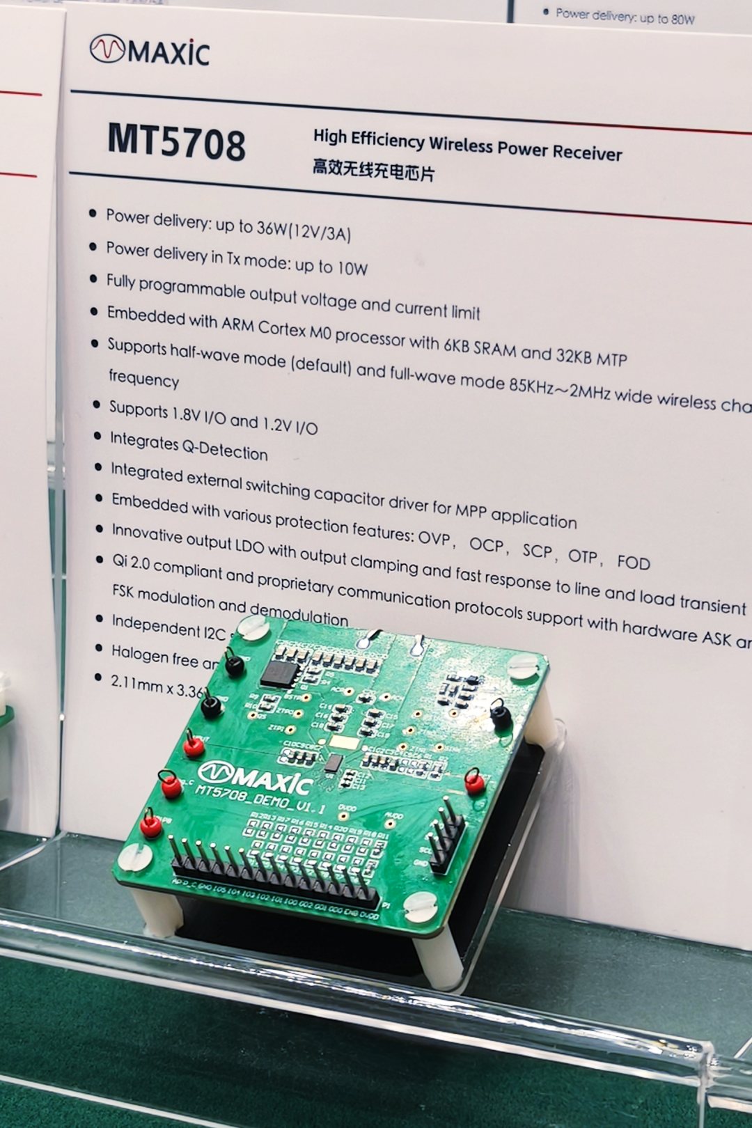 在無線充電接收端,重點展示了高度集成、高功率密度的36W無線充電RTX 芯片MT5708和高集成高效率支持BPP/EPP/MPP的100W無線充電RTX芯片MT5788。
