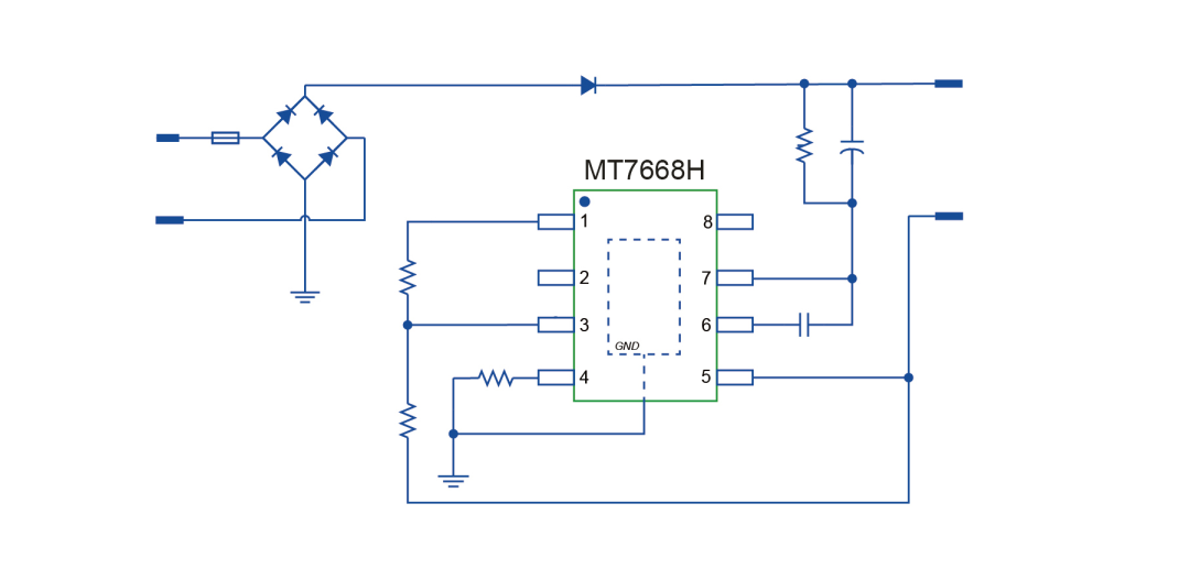 同時(shí),MT7668H內(nèi)部集成高壓功率管和高壓供電電路,無需電感、變壓器等磁性元件,外圍電路系統(tǒng)結(jié)構(gòu)更加簡(jiǎn)單。