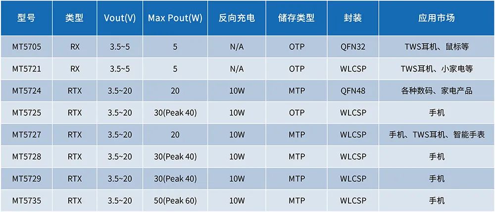 此次展示的接收端產(chǎn)品有MT5705,MT572X系列以及MT5735。功率覆蓋5W至50W,根據(jù)市場需要可支持反向充電功能,產(chǎn)品可廣泛應(yīng)用在手機、智能手表、TWS耳機、小家電、數(shù)碼等智能產(chǎn)品中。