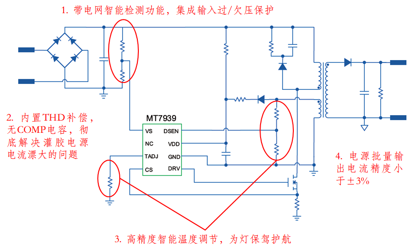 MT7939∣集成輸入過壓/欠壓保護的高PF隔離 超低THD恒流解決方案