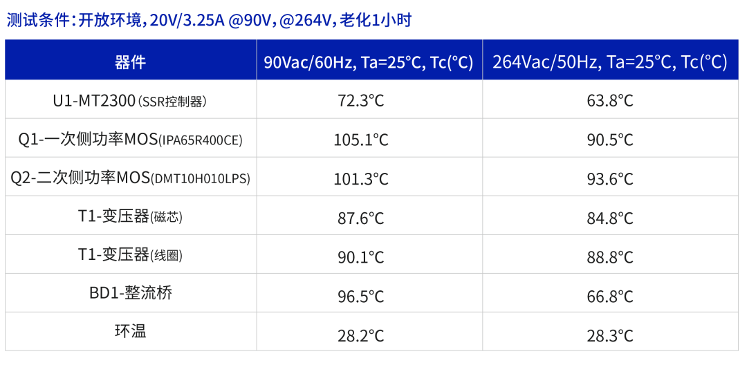 為保證產(chǎn)品的安全可靠性,設(shè)備長時間工作導致的發(fā)熱情況也是用戶的關(guān)注點。將方案在開放環(huán)境中,以20V/3.25A 65W的功率持續(xù)輸出1小時,各關(guān)鍵器件的溫度均保持在較好的溫度范圍內(nèi),符合安規(guī)要求,可靠性高。