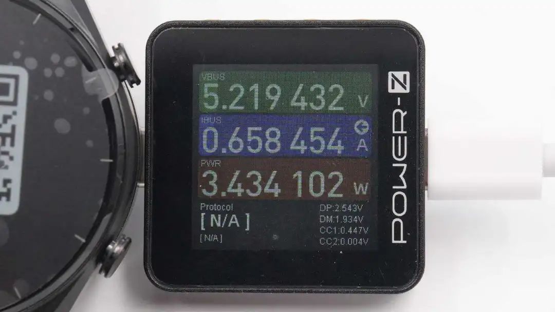手表內(nèi)置470mAh 超大容量電池,續(xù)航可達12天,出差一周都不用充電,可以降低外帶成本,和商務人士絕配。使用包裝自帶的無線充電底座給手機進行無線充電,通過ChargerLAB POWER-Z KM002C測得輸入功率為5.22V 0.66A 3.43W。