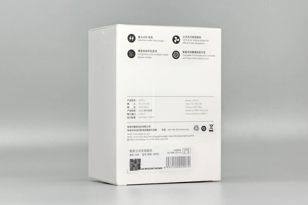 包裝盒為白色,設(shè)計也比較簡潔,正面印有MEIZU品牌、無線充外觀和名稱。