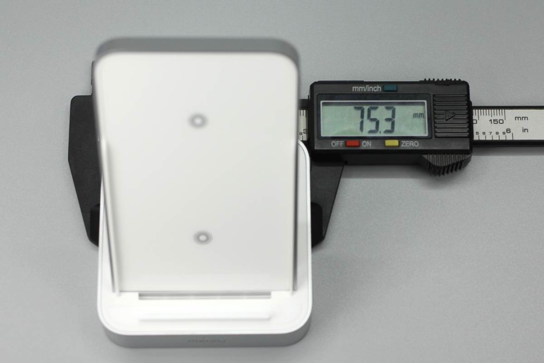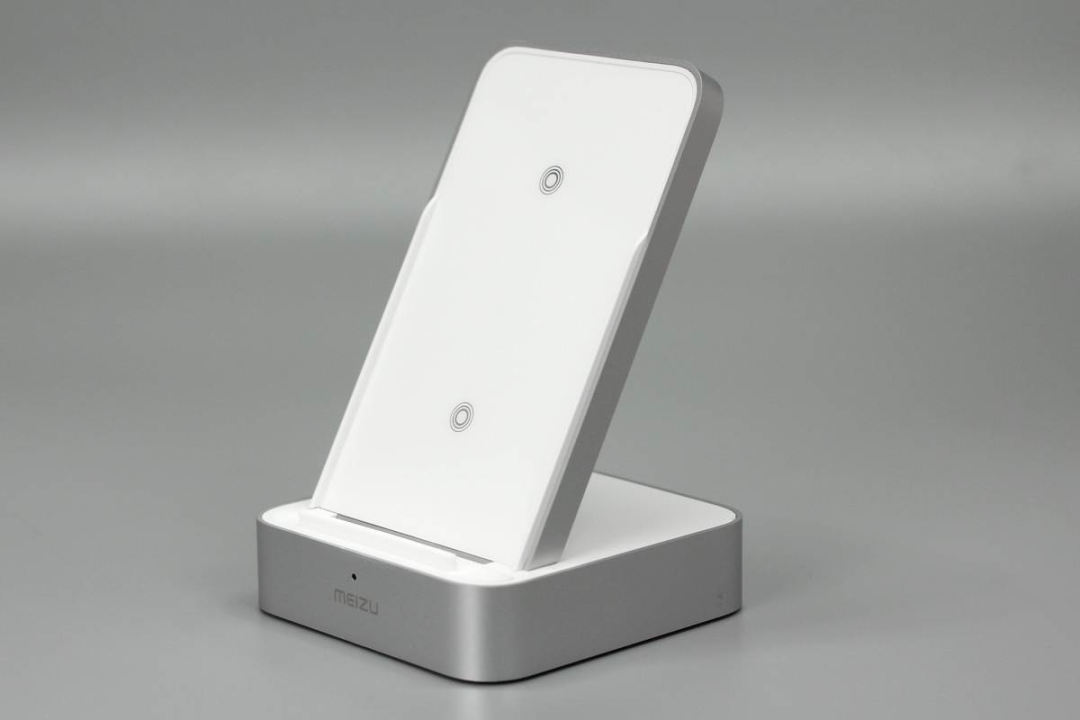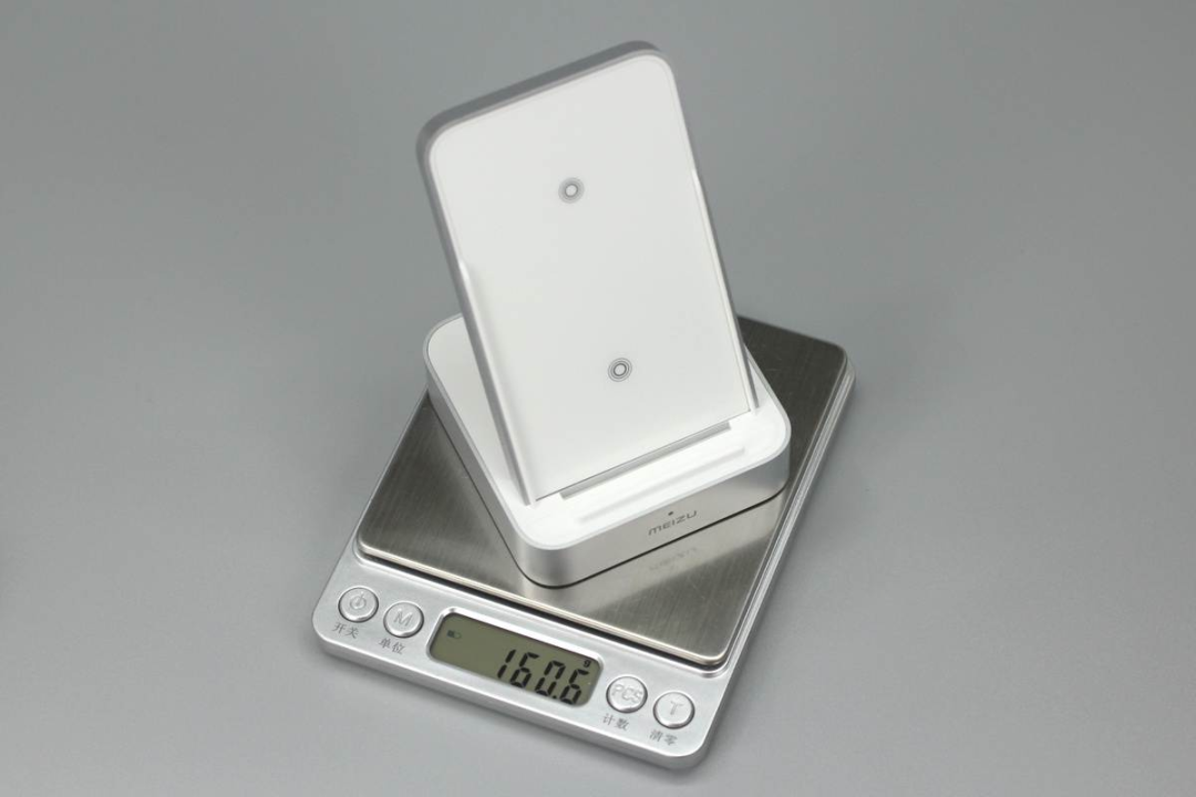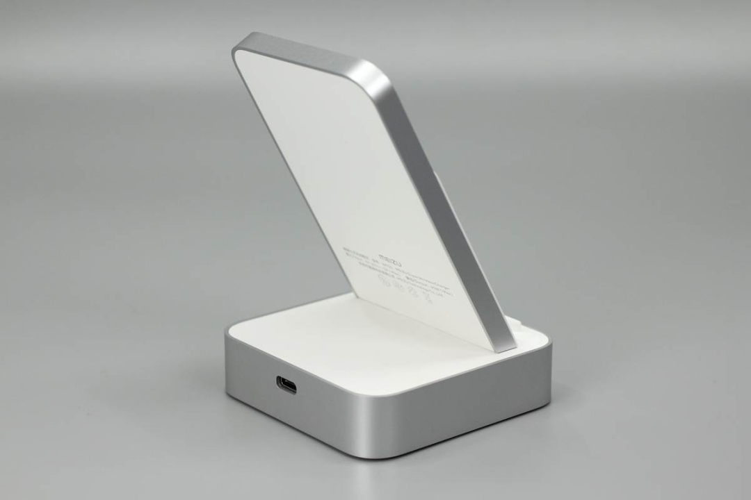 魅族這款無線充由底座和手機(jī)支撐板兩部分組成,支撐板正面是ABS材質(zhì)鋼化玻璃,十分光滑,支撐板和底座側(cè)身均噴砂銀灰色涂料進(jìn)行裝飾。