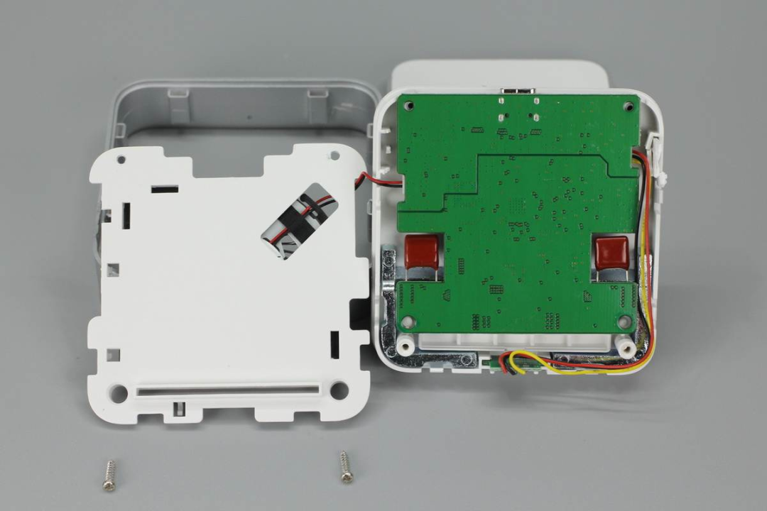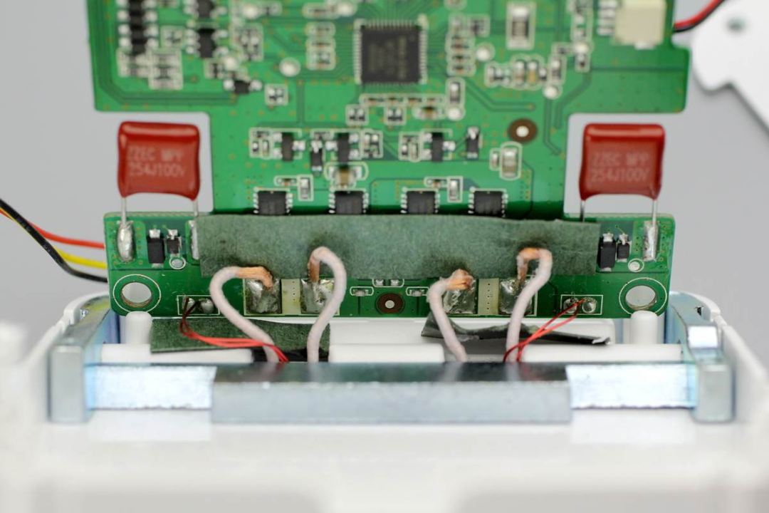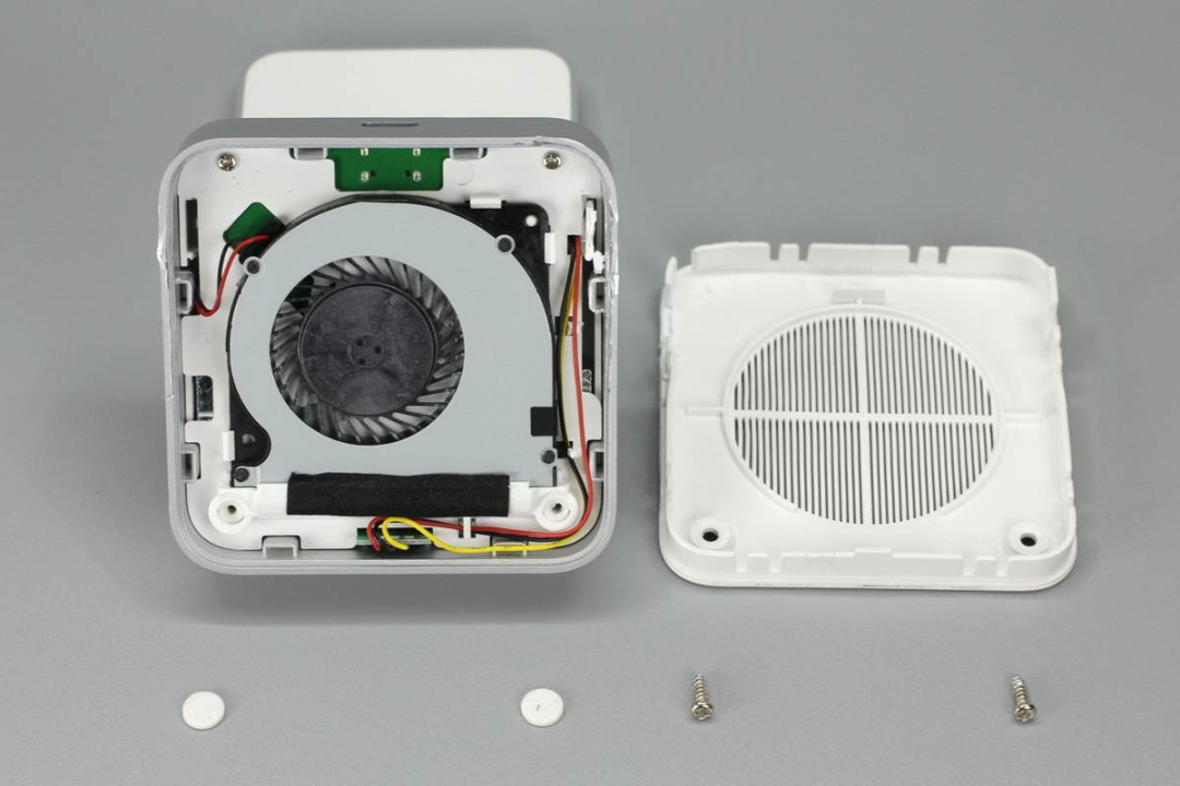 拆掉兩顆螺絲即可將底部外殼打開,風(fēng)扇使用卡扣進(jìn)行固定,并且風(fēng)扇和PCB板間有一塊白色塑料板進(jìn)行隔離。