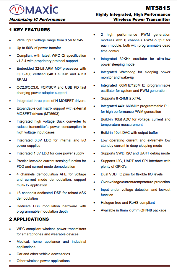 MT5815集成ARM M0 處理器,擁有卓越的高效率和緊湊設(shè)計,適用于各種低成本、低功耗應(yīng)用,可廣泛應(yīng)用于為5G智能終端、智能可穿戴設(shè)備、智能家居、物聯(lián)網(wǎng)、智能家電進(jìn)行無線充電的設(shè)備。充電頭網(wǎng)此前已對該芯片做了相關(guān)報道。