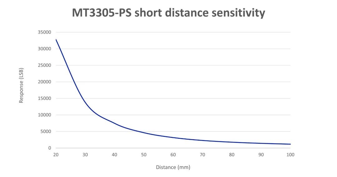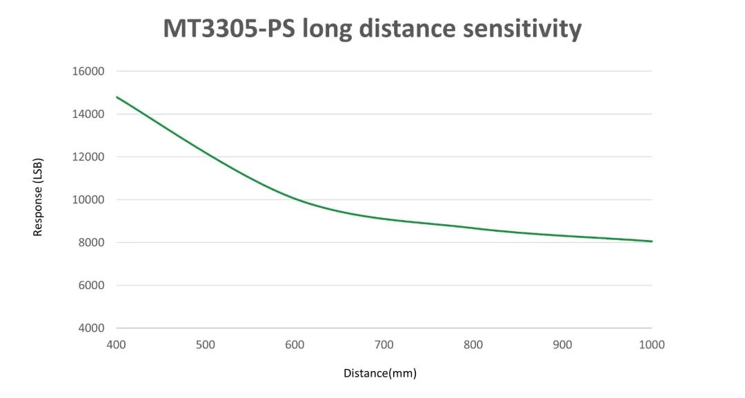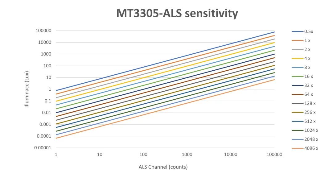 增益范圍越寬,靈敏度越高。MT3305可以實(shí)現(xiàn)0.5x~4096x的超寬增益范圍,不僅可以大大增強(qiáng)設(shè)備在暗光下的檢測(cè)能力,對(duì)強(qiáng)光環(huán)境同樣具備很好的適應(yīng)性。其環(huán)境光檢測(cè)靈敏度可達(dá)到<0.0005 Lux/LSB,接近檢測(cè)的距離可達(dá)到40cm以上。