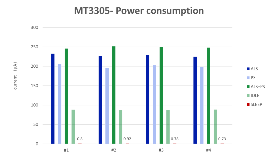 MT3305-SCR&SNR實(shí)驗(yàn)室數(shù)據(jù)對(duì)于高性能的傳感器芯片,低功耗是非常關(guān)鍵的參數(shù)指標(biāo)。在提供同等電能的條件下,芯片的待機(jī)功耗低至0.7μA,工作功耗最大保持在260μA以內(nèi),這意味著芯片在運(yùn)行過程中可以增強(qiáng)系統(tǒng)的待機(jī)時(shí)長(zhǎng),大大降低發(fā)熱量,帶給設(shè)備更好的使用性能。