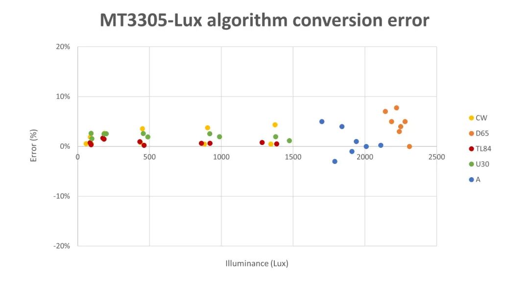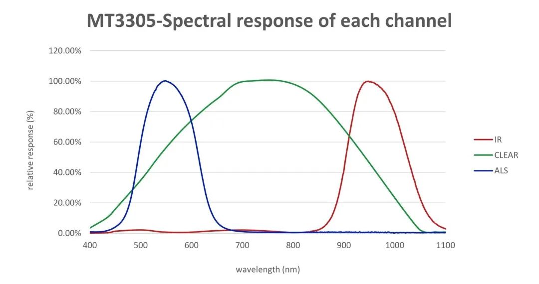MT3305晶圓采用專用光學(xué)鍍膜技術(shù),可以有效提高光學(xué)特性,通過在感應(yīng)區(qū)上采用不同的鍍膜來實(shí)現(xiàn)ALS、IR、CLEAR的光譜響應(yīng)。ALS通道符合人眼響應(yīng)光譜曲線,IR通道以940nm為中心頻點(diǎn)只對(duì)高紅外部分光線響應(yīng),CLEAR通道對(duì)全光譜進(jìn)行響應(yīng),結(jié)合美芯晟自研的Lux轉(zhuǎn)換算法,能夠?qū)⒉煌庠聪碌恼斩戎嫡`差有效地控制在10%以內(nèi),使得MT3305的照度識(shí)別更加準(zhǔn)確。