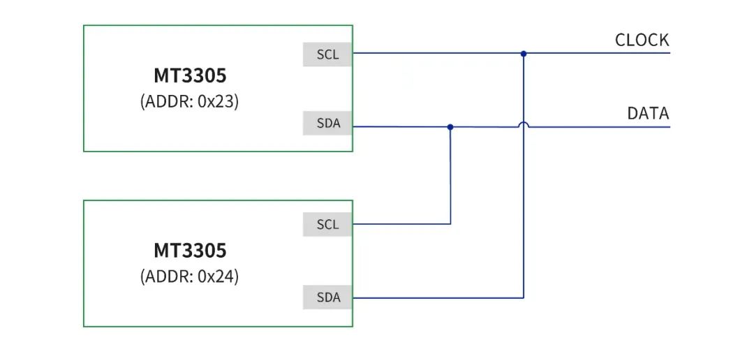 MT3305支持SCL、SDA正反接切換器件地址,可以在一條總線上實(shí)現(xiàn)雙芯片同時(shí)使用,這樣可以在節(jié)約總線資源的前提下,實(shí)現(xiàn)多維度的距離感知、全方位的環(huán)境光強(qiáng)感應(yīng),幫助客戶實(shí)現(xiàn)更精準(zhǔn)、更智能的產(chǎn)品應(yīng)用。