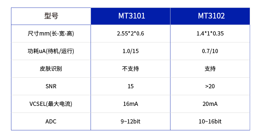 美芯晟最新推出的MT3102是一款超小尺寸、超低功耗、集成940nm VCSEL的數(shù)字光學(xué)接近傳感器,封裝尺寸僅有1.4mm*1mm*0.35mm,待機(jī)功耗低至0.7uA,配有公司自研高精度皮膚識(shí)別算法,有效提升入耳檢測(cè)效率,識(shí)別率>98%@3mm,對(duì)于常規(guī)的非皮膚組織,如桌子,書本,衣服,金屬等誤識(shí)率<5%@3mm,主要應(yīng)用于 TWS/OWS等無線藍(lán)牙耳機(jī)、便攜式智能硬件產(chǎn)品、智能手表手機(jī)等。