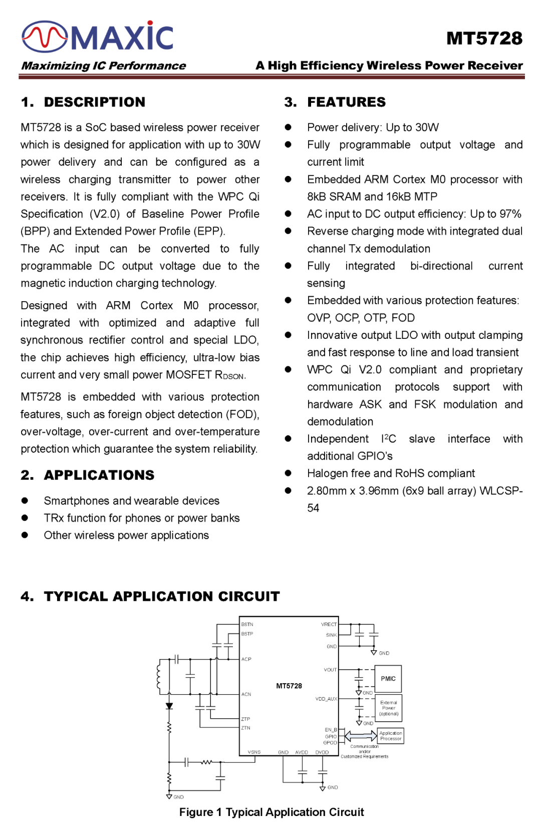 MT5728 offers various protections, including OVP, OCP, OTP. It supports I2C and configurable GPIO interfaces and is packaged in WLCSP54, suitable for wireless charging applications in smartphones, power banks, tablets, and other electronic devices.
