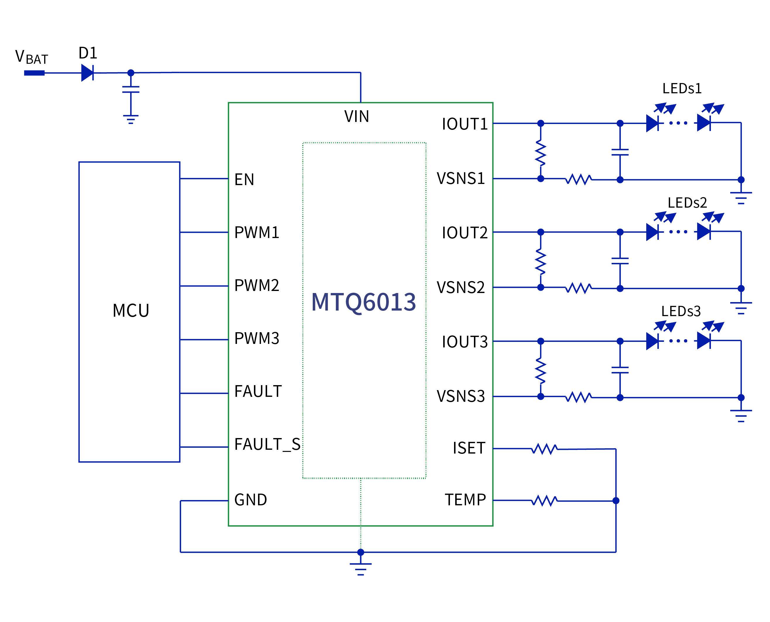 MTQ6013 provides complete diagnosis functions to meet automotive-grade requirements. It has two fault pins: FAULT pin and FAULT_S pin. FAULT_S pin is a dedicated fault pin for single-LED short circuit fault and FAULT pin is for general faults, i.e., short circuit, load open, and thermal shutdown, making the chip meet various application requirements.